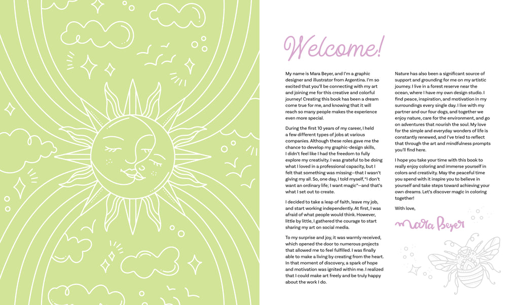 Mara Beyer is an international art influencer, illustrator, and pattern artist with 23,000 followers who love her intricate designs and creative insights. With over a decade of experience in branding, packaging, and product-applied art, she has collaborated with global brands across Latin America, the US, and the Middle East. Her coloring book brings her signature detailed style to life, inviting colorists to relax, explore, and express themselves through art. She lives in Mar del Plata, Argentina. Learn more on Instagram @marabeyer_.